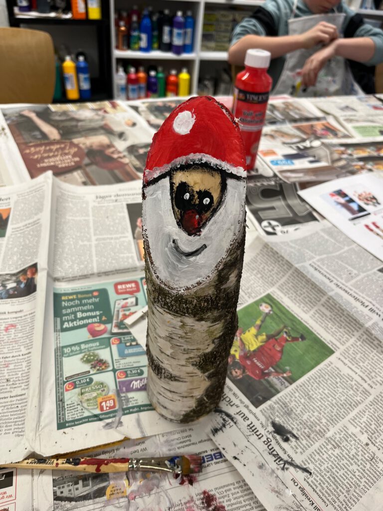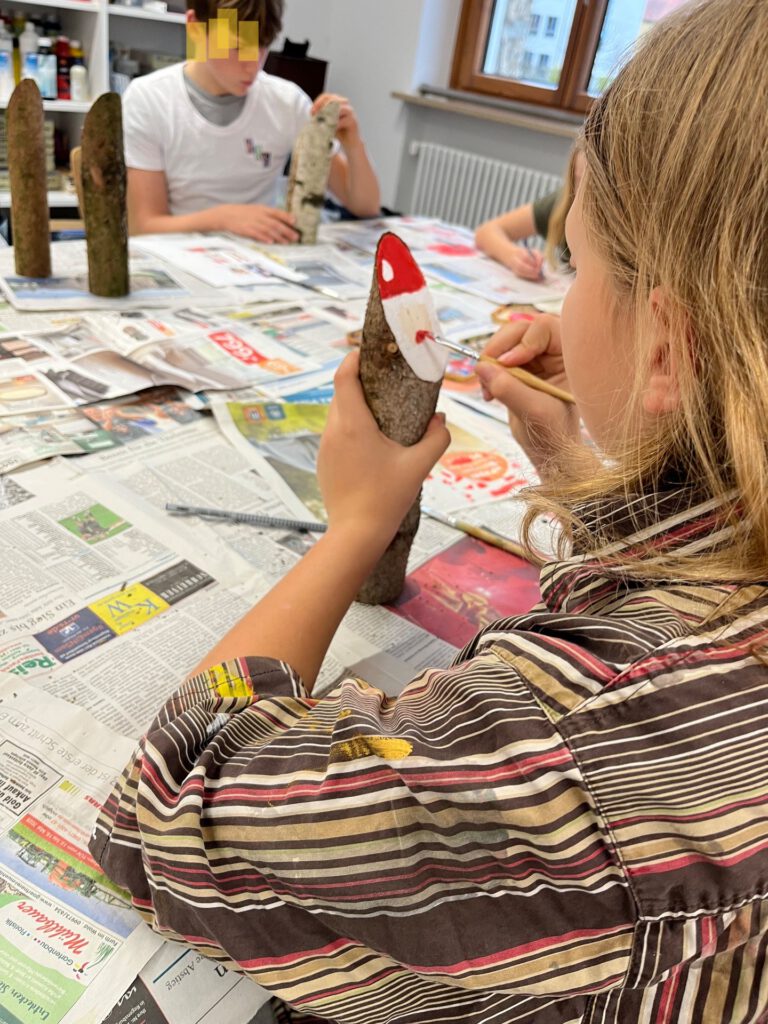 Anschließend ging es kreativ weiter: Aus einfachen Materialien entstanden kleine Kunstwerke mit weihnachtlichem Flair. Baumstämme wurden zu fröhlichen Nikoläusen bemalt, Tannenzapfen verwandelten sich in kleine Wichtel, und Streichholzschachteln wurden mit viel Liebe zu Mini-Krippen gestaltet. Die Minikrippen werden nach Fertigstellen an die Bewohner des benachbarten Seniorenheimes überreicht. Überall wurde gelacht, gemalt und gewerkelt – und die Freude über die entstandenen Werke war groß.