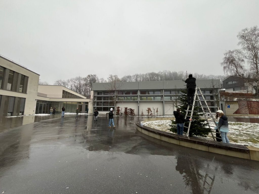 Doch damit nicht genug: In Teamarbeit mit Hausmeister Stefan Pongratz unterstützten die tatkräftigen Schülerinnen und Schüler beim Vorbereiten des Christbaums. Mit funkelnden Lichterketten und viel Engagement verwandelten sie den Baum in ein leuchtendes Symbol der Schulgemeinschaft.
